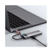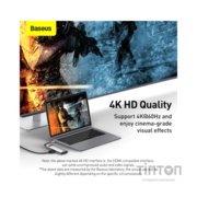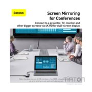 USB-хаб Baseus Metal Gleam допоможе вам розширити можливості вашого ноутбука та збільшить кількість роз'ємів. Роз'єми USB 3.0 дадуть вам під'єднувати інші ґаджети, як-от флешнакопичувачі, мишку, клавіатуру тощо. А наявність порту USB-C (PD) дасть змогу паралельно заряджати ваш ноутбук із максимальною потужністю 100 Вт. Під'єднуйте монітор, проєктор, телевізор та відтворення відео або презентації на великому екрані завдяки роз'єму 4K HD.