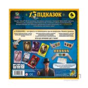 ОПИС НАСТІЛЬНОЇ ГРИ 13 ПІДКАЗОК (13 CLUES) Лондон 1899 рік. Місто шоковане жахливими злочинами. Скотланд-Ярд у відчаї і просить допомоги у вас, найкращих детективів міста. Події у грі 13 Підказок відбуваються в кінці 19 століття, де гравці в ролі детективів, кожен з яких намагається розгадати власний таємничий злочин. ЯК ГРАТИ Кожен гравець бачить три підказки, які поділяються на: Особа, Місце злочину та знаряддя вбивства. Також гравцям відомі усі карти своїх супротивників (окрім тих, що знаходяться у них за ширмою).Ваша ціль вирахувати набір карток який заходиться на лицевій стороні вашої ширми і щоб зуміти це потрібно буде добряче напружити мізки. Гравці проводять розслідування, ставлячи запитання один-одному, консультуючись із таємним інформатором і висуваючи звинувачення, щоб зібрати зачіпки та вичислити підозрюваних. Мета гри полягає в тому, щоб визначити, яка з 13 підказок відповідає вашій справі раніше, ніж інші!ДЛЯ КОГО ГРА 13 Підказок — чудовий шанс поринути у світ Пуаро та Шерлока Холмса, - персонажів, вписаних в історію людства завдяки своїй спостережливості, дедуктивним навичкам... і тим, хто писав історію їхніх пригод. у грі 13 Підказок вам також випаде шанс втілити власну історію та стати визначним детективом.