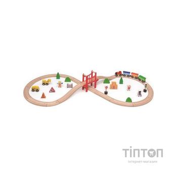Набір містить 39 дерев'яних деталей, включаючи рейки, поїзди, машини, дорожні знаки, фігурки людей. Легко і швидко зібравши дорогу з деталей набору, ваш малюк порине в захопливий світ транспорту.