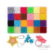 До комплекту, крім безлічі різнобарвних перлин, входить набір додаткових аксесуарів.До набору аксесуарів входять 26 предметів: трафарети з уже готовими виробами, пінцети, спеціальна ємність для води, підставки різної геометричної форми та площі, лопатка та карабіни для браслетів і каблучок.Як грати: