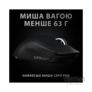 БЕЗ КОРДОНІВЦя миша, найлегша і швидка з усіх моделей серії PRO, допоможе вам усунути всі перешкоди на шляху до перемоги. Нова зброя, яке вибирають переможці світових чемпіонатів, важить менше 63 грамів і забезпечує мінімальне тертя при ковзанні по поверхні. Модель PRO X SUPERLIGHT служить продовженням нашої концепції «БЕЗ КОРДОНІВ»: ми прагнемо прибрати всі перешкоди, встановивши максимально тісний зв'язок між геймером і грою.БЕЗ КОМПРОМІСІВРозробка найлегшою з усіх моделей серії PRO, миші PRO X SUPERLIGHT, стала важливим технічним досягненням. Її вага вдалося знизити до 63 грамів - а це майже на 25% менше будь-який зі стандартних бездротових мишей PRO. Такого значного зменшення ваги конструкції вдалося досягти в результаті серйозних зусиль наших фахівців, а не за рахунок погіршення робочих характеристик пристрою.БЕЗ ЗАТРИМОКІнноваційна бездротова технологія професійного рівня LIGHTSPEED, що забезпечує надійне підключення і миттєвий відгук, дозволяє зосередитися на головній меті - перемозі в змаганні.без промахуМиша оснащена ексклюзивним датчиком HERO 25K від Logitech G, тому вона реагує на натискання виключно швидко, точно і злагоджено. Завдяки неперевершеної точності і зручності управління модель PRO X SUPERLIGHT гарантує гравцеві повну впевненість, особливо під час напружених ігрових сеансів, коли рахунок йде на долі секунди.БЕЗ ОПОРУВелике підставу з тефлоновим покриттям без добавок гарантує плавне ковзання по поверхні, що неодмінно порадує справжніх цінителів хорошої гри.БЕЗ ЗАБРУДНЕННЯ НАВКОЛИШНЬОГО СЕРЕДОВИЩАМиша PRO X SUPERLIGHT відповідає найвищим стандартам екологічної безпеки. Це продукт з нульовим балансом викидів вуглецю. Наші виробничі підприємства скоротили викиди вуглецю до нульового рівня за рахунок придбання сертифікатів, що підтверджують отримання енергії з поновлюваних джерел, і вуглецевих заліків.